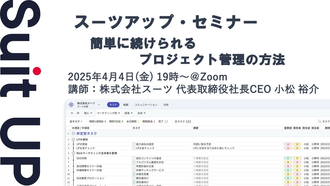 株式会社スーツ(所在地:東京都千代田区、代表取締役社長CEO:小松 裕介)は、2025年4月4日(金)19時から、当社代表の小松が講師を務めるスーツアップ・セミナー「簡単に続けられるプロジェクト管理の方法」を無料開催します。