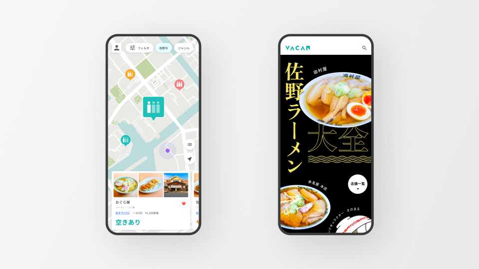 各店舗や施設の情報は、VACANが提案するマップ型混雑情報配信サービス「VACAN Maps(バカン マップス、以下 Maps)」および、専用ページで配信します。佐野市のラーメン店のリアルタイム混雑情報や観光地情報を提供し、来店時間の分散や待ち時間の短縮を実現します。