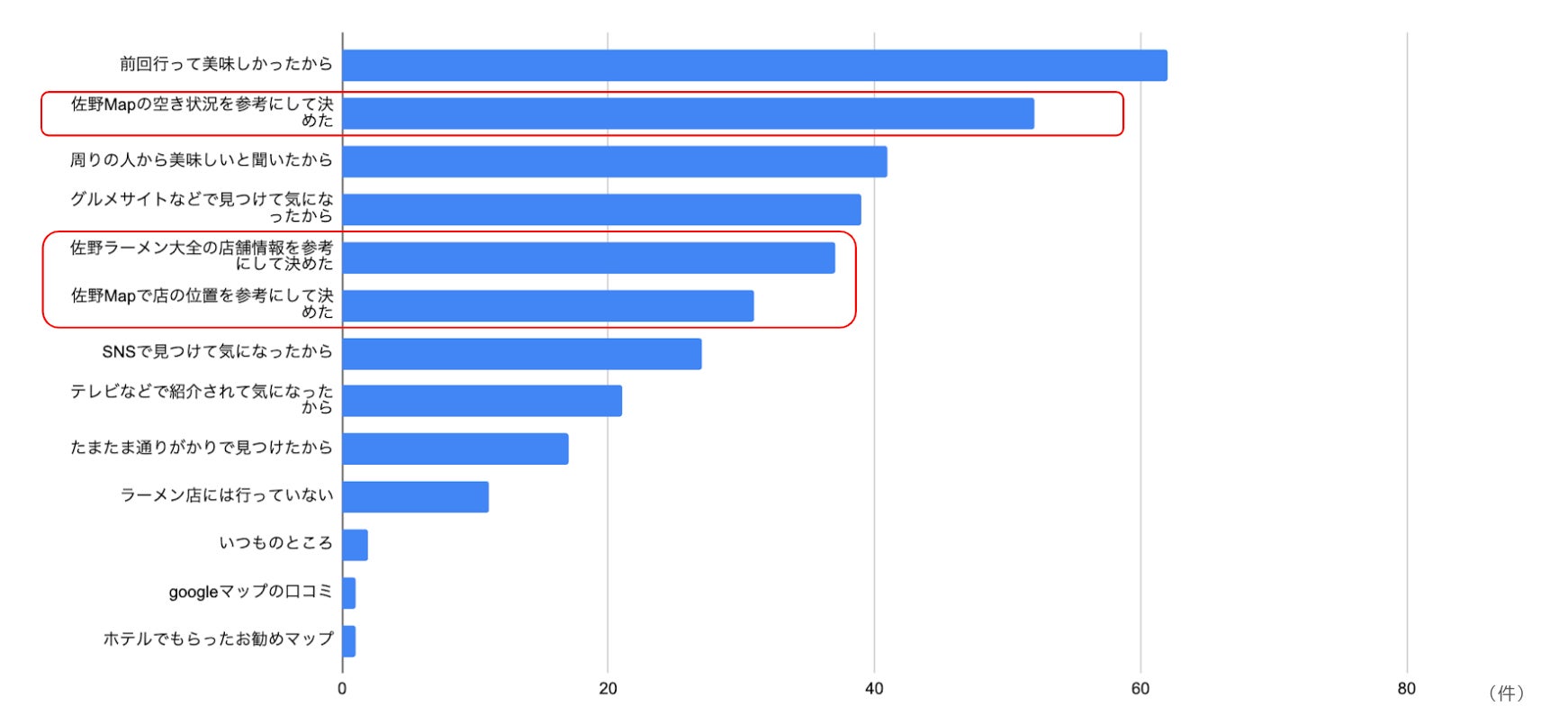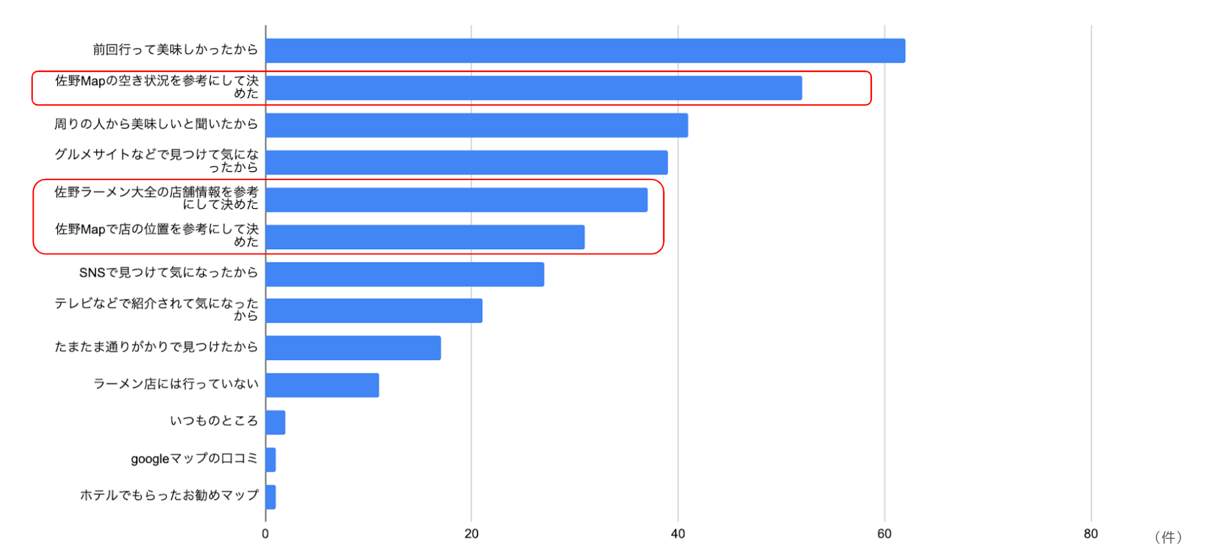 「空き状況を参考にして決めた」という回答が2番目に多く、ユーザーの店舗の混雑状況配信への興味関心度合いの高さが伺える。