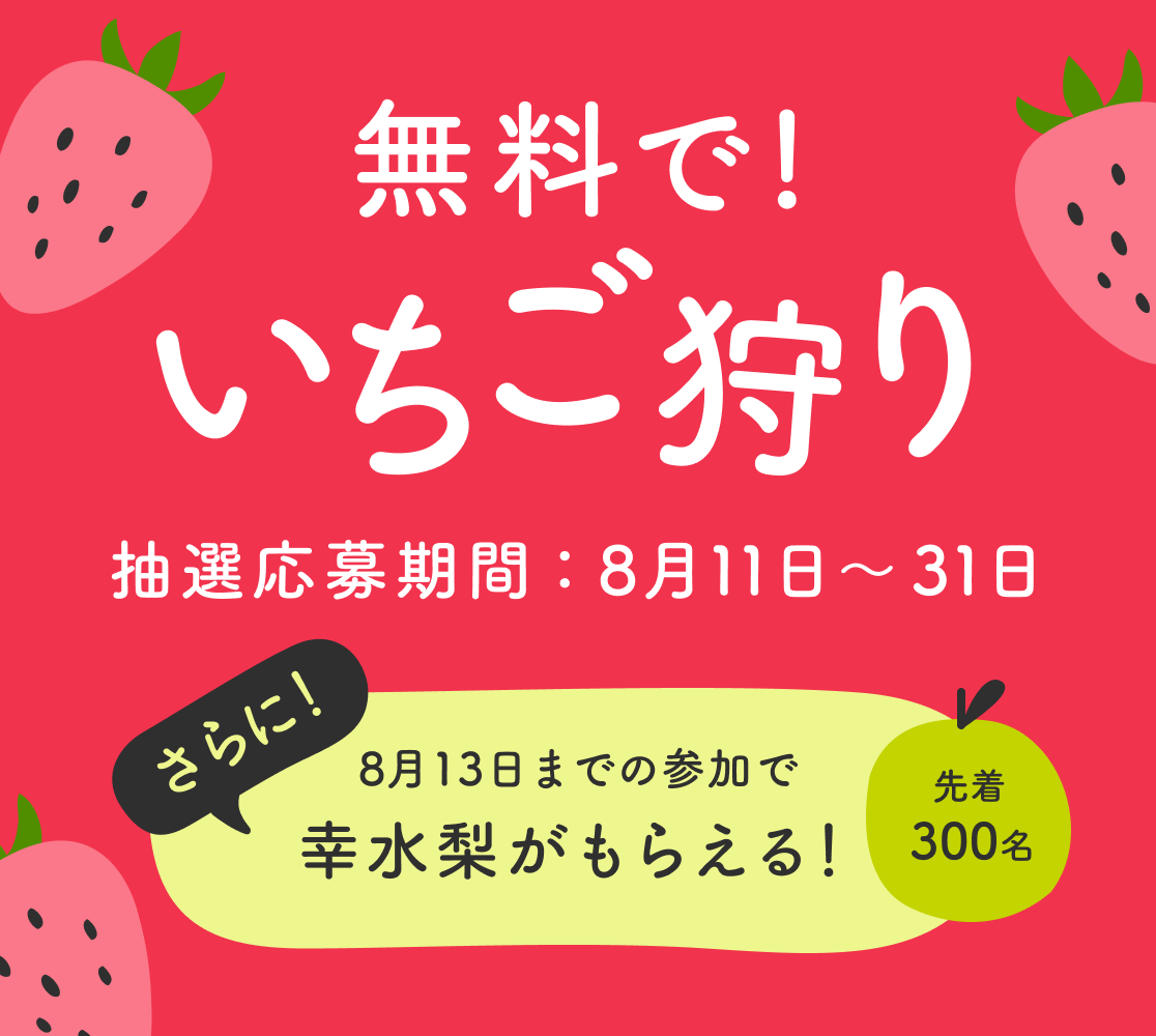抽選で20名様15組30名様にいちご狩り無料チケットプレゼント。市内の観光地13箇所にMapsに繋がるQRとキャンペーンコードが設置されており、それらを使ってアンケートに回答することでいちご狩り無料チケットを受け取れる。