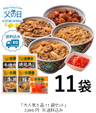 株式会社吉野家(本社:東京都中央区 代表取締役社長 河村泰貴、以下吉野家)は、6月21日(金)10時まで、「吉野家公式通販ショップ」他ECモール店舗で『父の日限定セット』を販売中です。