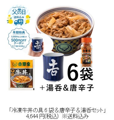 「冷凍牛丼の具」や「冷凍うなぎ蒲焼き」などの人気商品をお得な詰め合わせセットにした『父の日限定セット』を現在、「吉野家公式通販ショップ」他ECモール店舗で販売しています。“感謝”の文字をあしらった吉野家の丼がセットになった商品もあります。本日から新たに「冷凍牛丼の具」と吉野家の湯呑を一緒にお届けする「冷凍牛丼の具6袋&唐辛子&湯呑セット」の販売を開始しました。湯呑みの他、吉野家の丼も詰め合わせにしたセット商品もあります。なお、『父の日限定セット』の価格はすべて送料込みとなります。また、5,000円以上となる『父の日限定セット』を購入した方には、6月7日(金)10時まで使用できる500円オフクーポンを配布します。