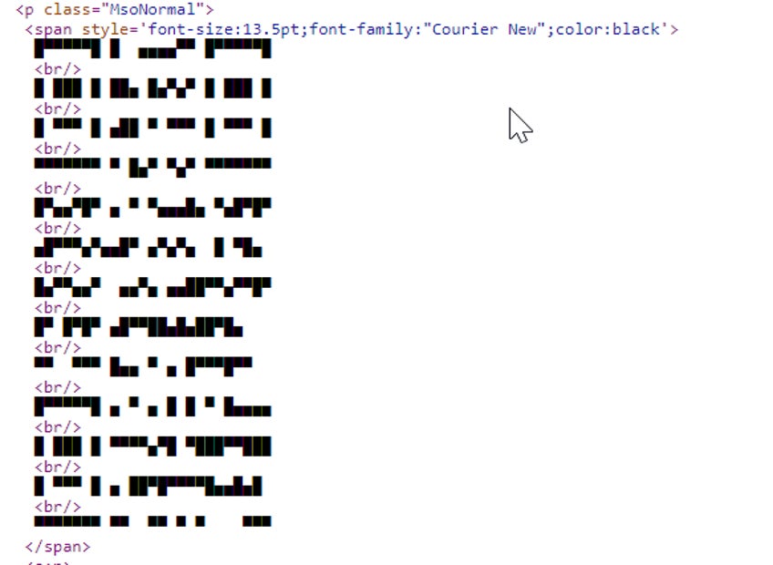 非常に微妙な違いですが、従来フィッシングに使用されたQRコードは画像であるのに対し、新しく利用されたものはHTMLで作成されており、問題はその点にあります。こうしたQRコードはOCRエンジンの回避を目的として、ASCII文字で生成されています。このHTMLを細かく見ると、以下のようになっています。