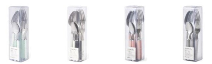 持ち手にシンプルなロゴが施されたディナースプーン、ディナーフォーク、ティースプーン、ケーキフォークが2本ずつ入ったカトラリーセットです。