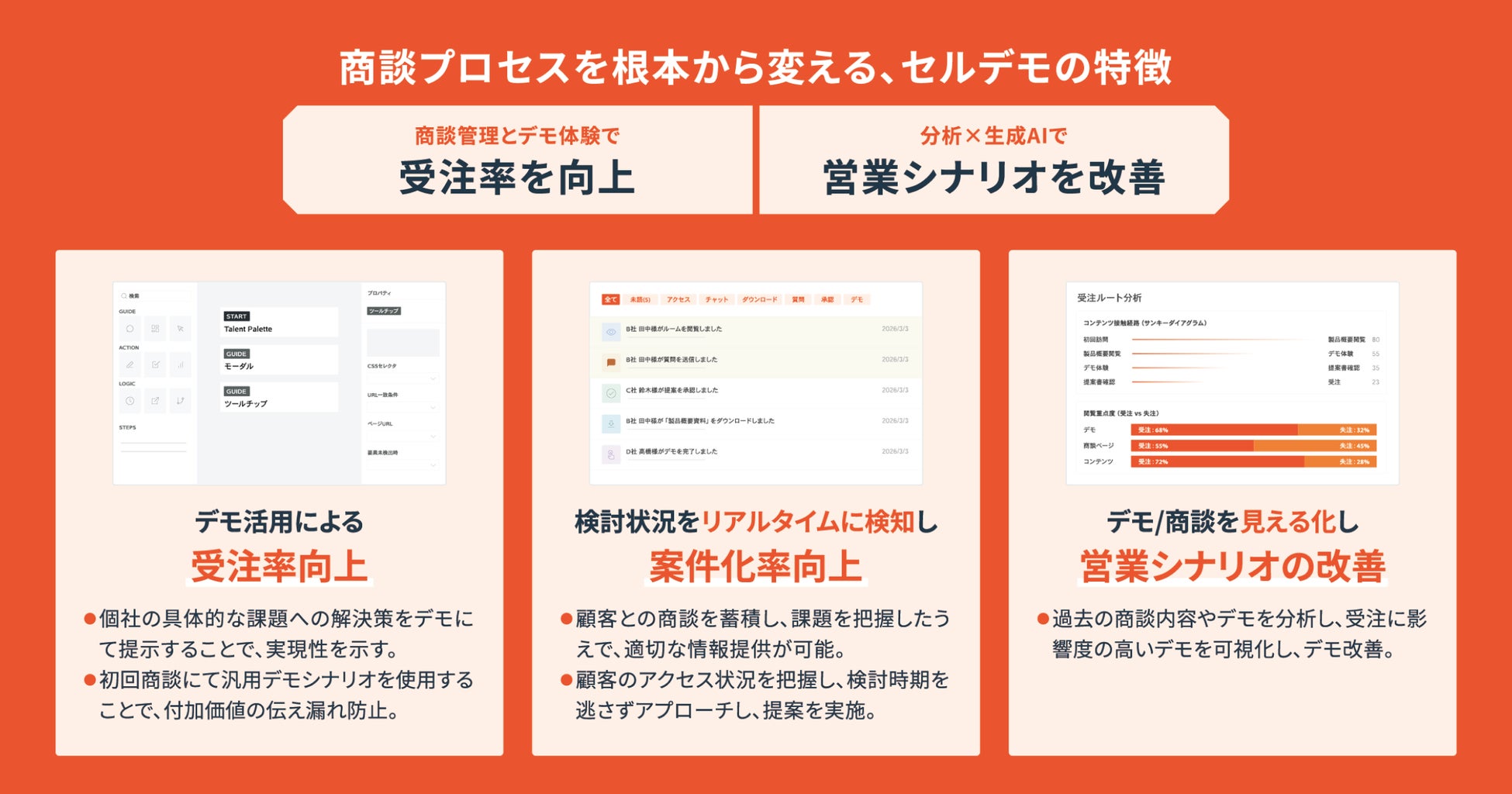さらに、商談ログの蓄積・分析機能により、受注に寄与するデモや営業シナリオの継続的な改善を実現します。