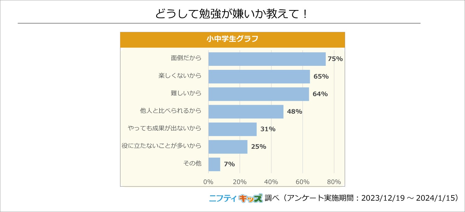 勉強が嫌いな人の理由として最も多いのは「面倒だから」で、75%でした。次に「楽しくないから」「難しいから」と続きます。