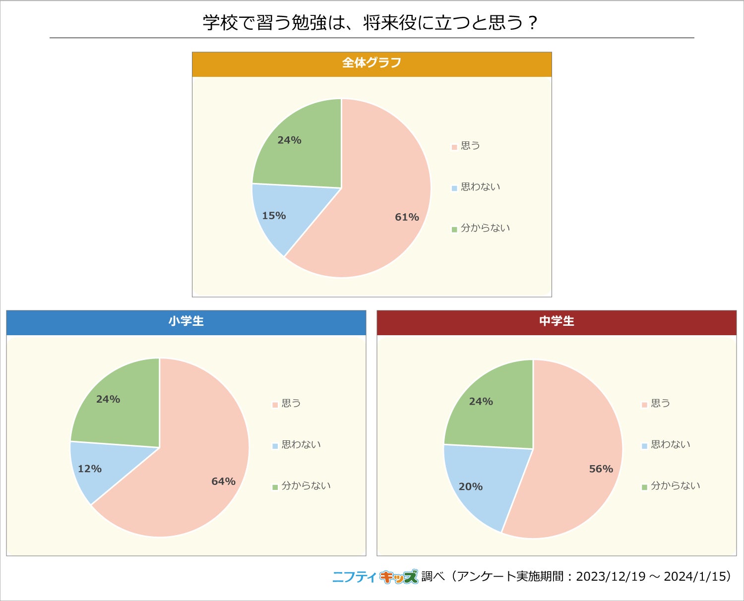 学校の勉強について、半数以上の人が将来の役に立つと「思う」と答えました。