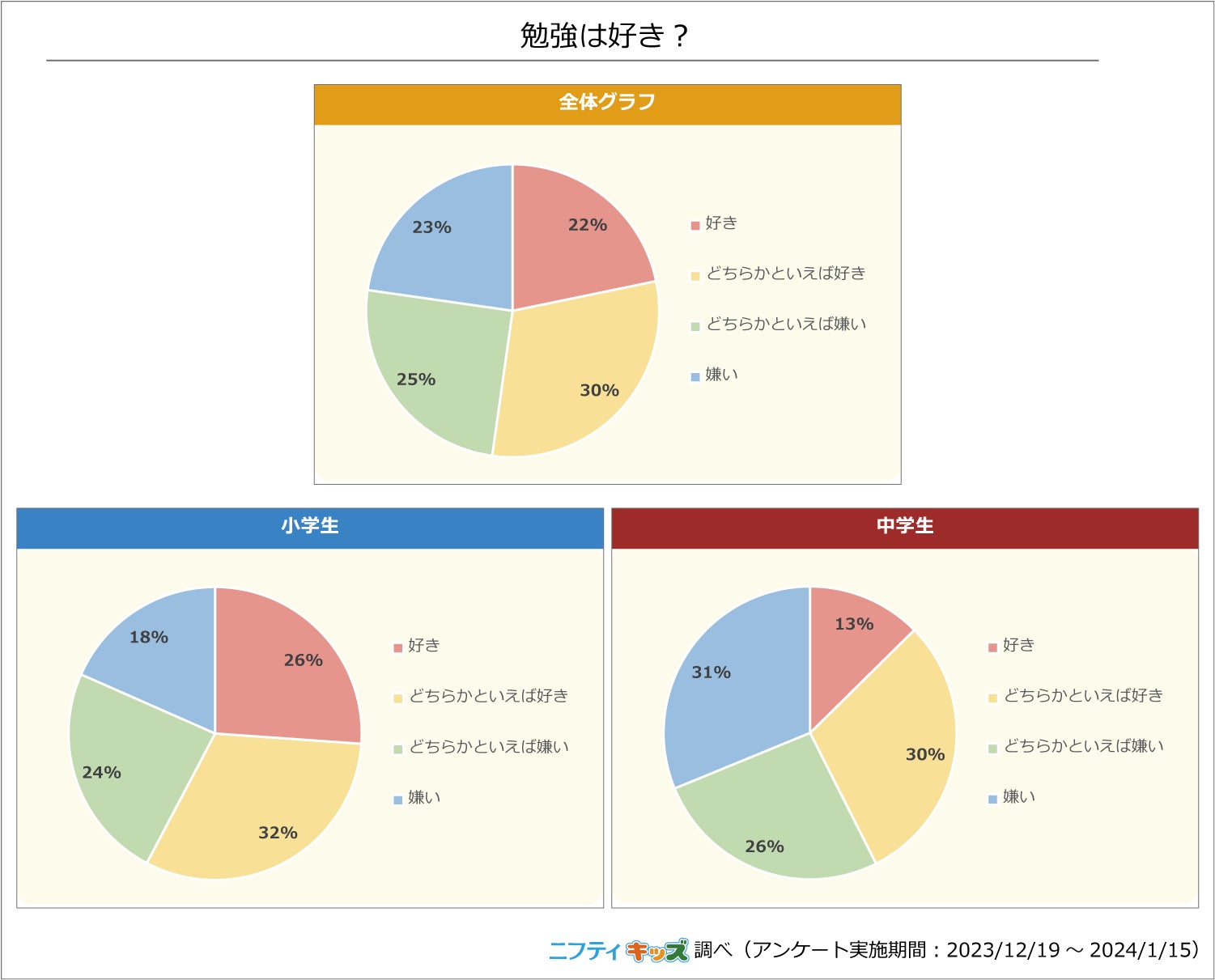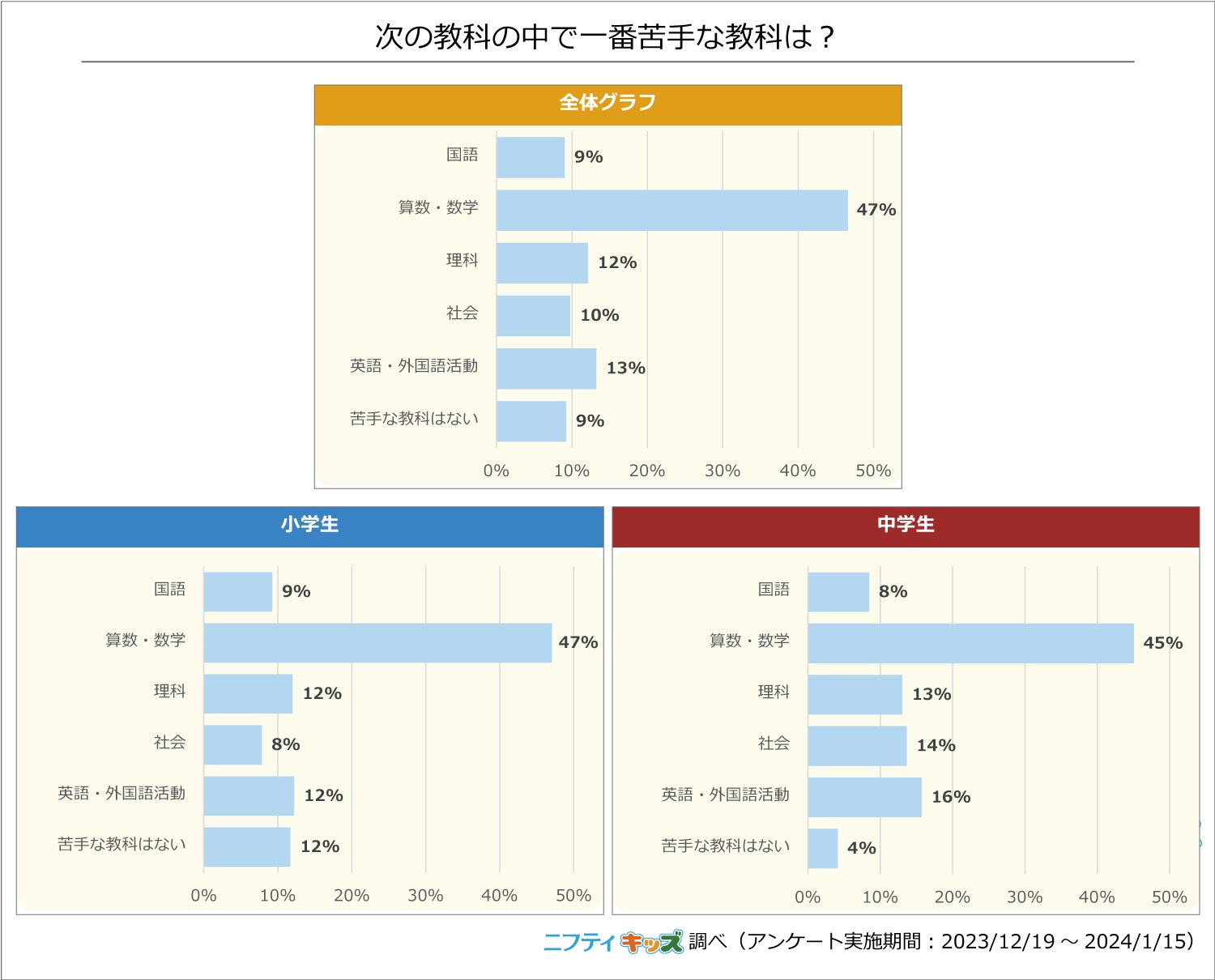 【調査結果】勉強が好きな割合は小学生58%に対し中学生43%。苦手な教科は「算数・数学」が圧倒的1位