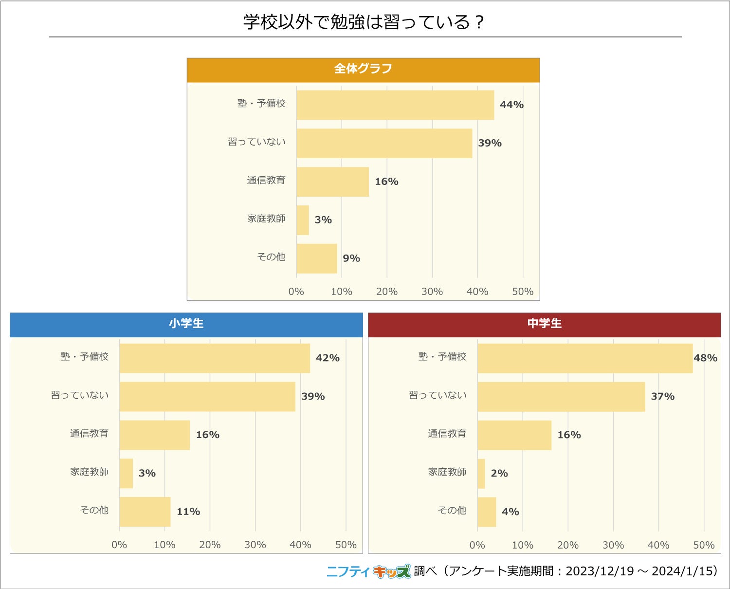 全体の44%が「塾・予備校」に通っていることがわかりました。中学生になると高校受験を意識する人が増えることから、小学生よりも塾・予備校に通う人が増えていると考えられます。