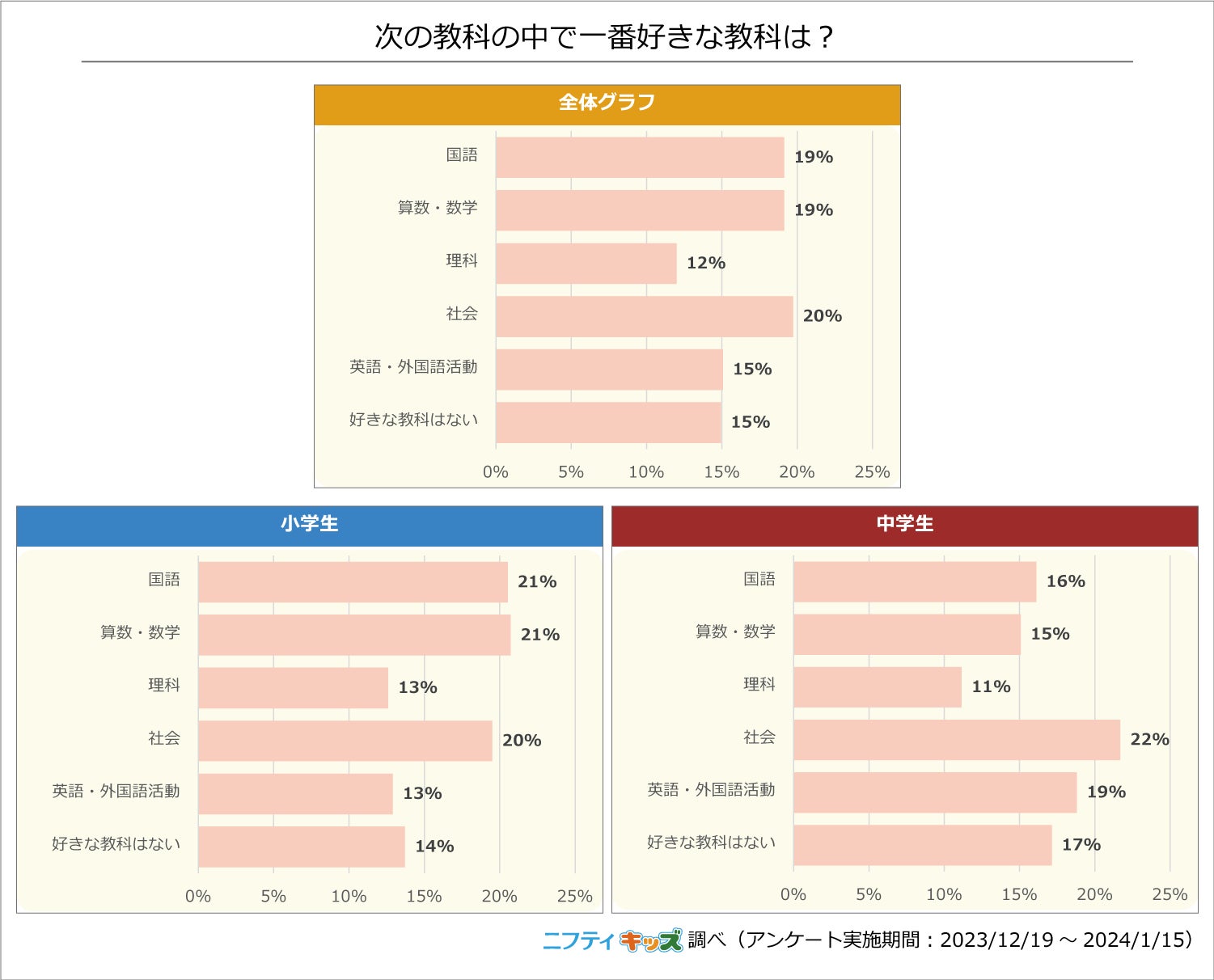 全体で最も人気のあった教科は「社会」でした。小学生は「国語」「算数・数学」がトップでしたが、中学生になるとどちらも減少しています。中学生では「社会」に次いで「英語・外国語活動」にも人気が集まりました。
