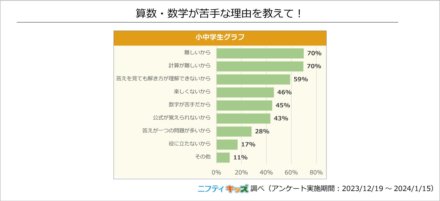 「算数・数学」を苦手だと感じる理由は「難しいから」「計算が難しいから」が、ともに70%でした。他の選択肢と比べても10%以上の差があり、多くの人が算数・数学を難しいと感じているのがわかります。