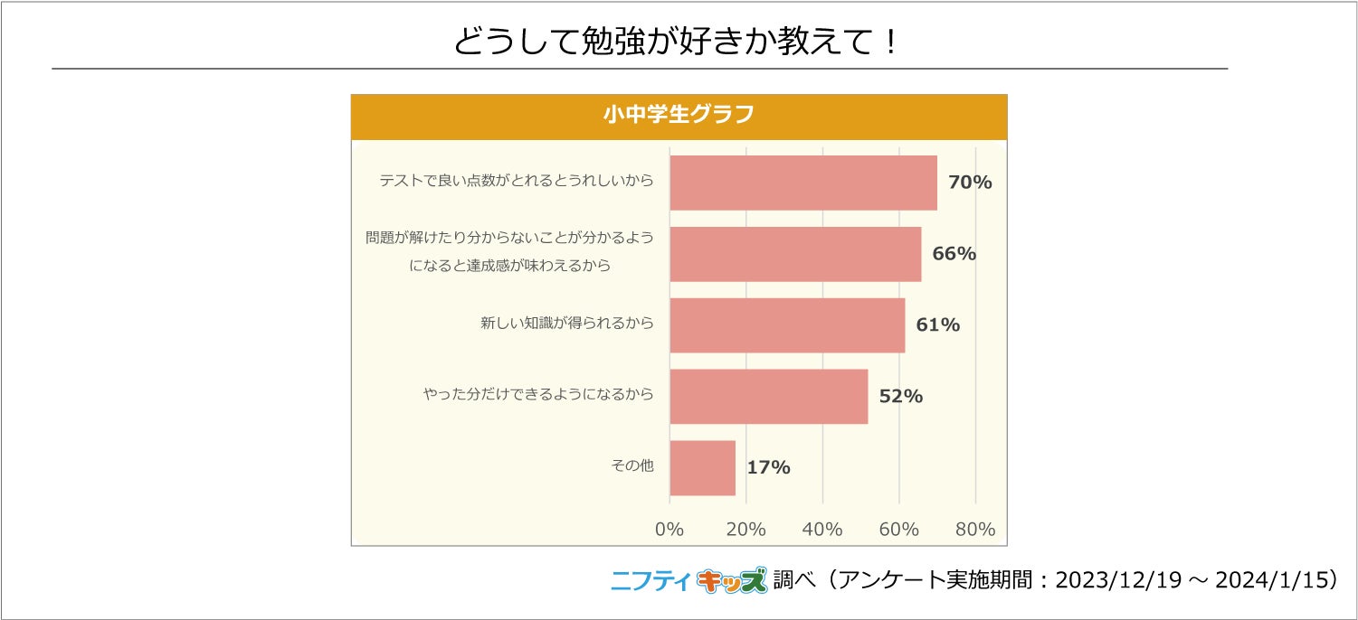 勉強が好きな理由としては、「テストで良い点数がとれるとうれしいから」が70%と最も多い結果でした。目に見える形で結果が出ると、頑張りが報われた気持ちになるのかもしれません。