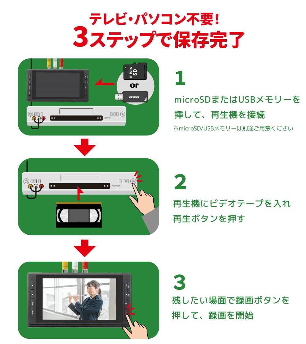 パソコン不要、ビデオデッキなどの再生機と接続するだけ