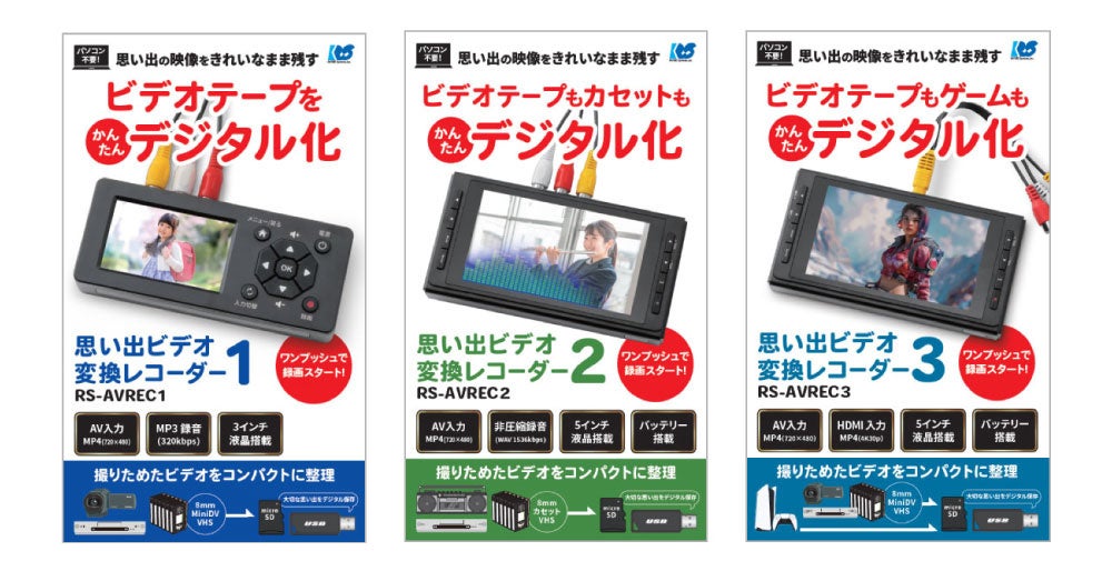 思い出ビデオ変換レコーダーは、アナログ映像のデジタル化を軸に、3機種をラインナップしています。カセットテープのデジタル化に対応したモデル、ゲームの録画や配信にも使えるモデル、大型画面とバッテリー駆動で本体視聴にも適したモデルなど、ニーズにあわせて選んでいただけます。