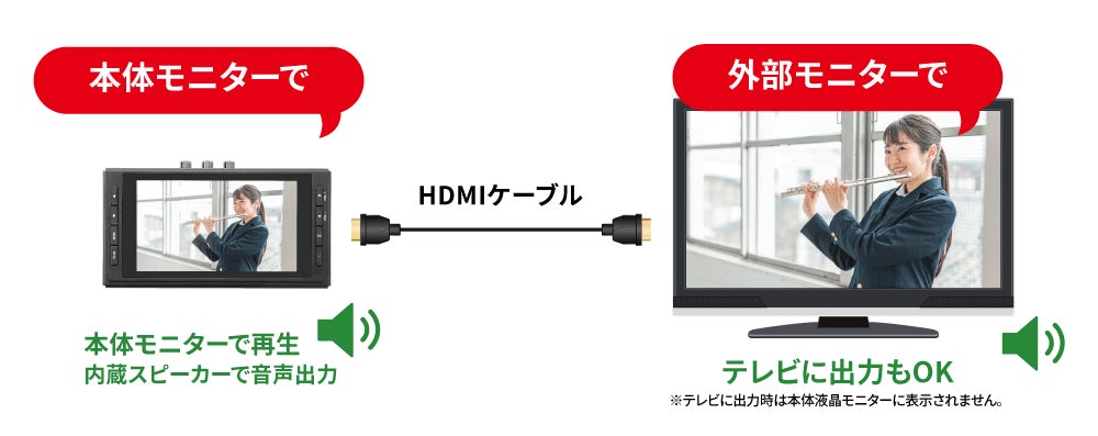 本体モニターの画面は、テレビやモニターとHDMI接続で大画面表示することが可能です。