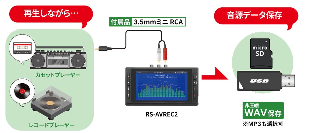 本製品にカセットテープやレコードなどのアナログ音源を本製品に入力して、デジタル化が可能。RS-AVREC2はMP3のほか、非圧縮フォーマットWAV形式にも対応しています。