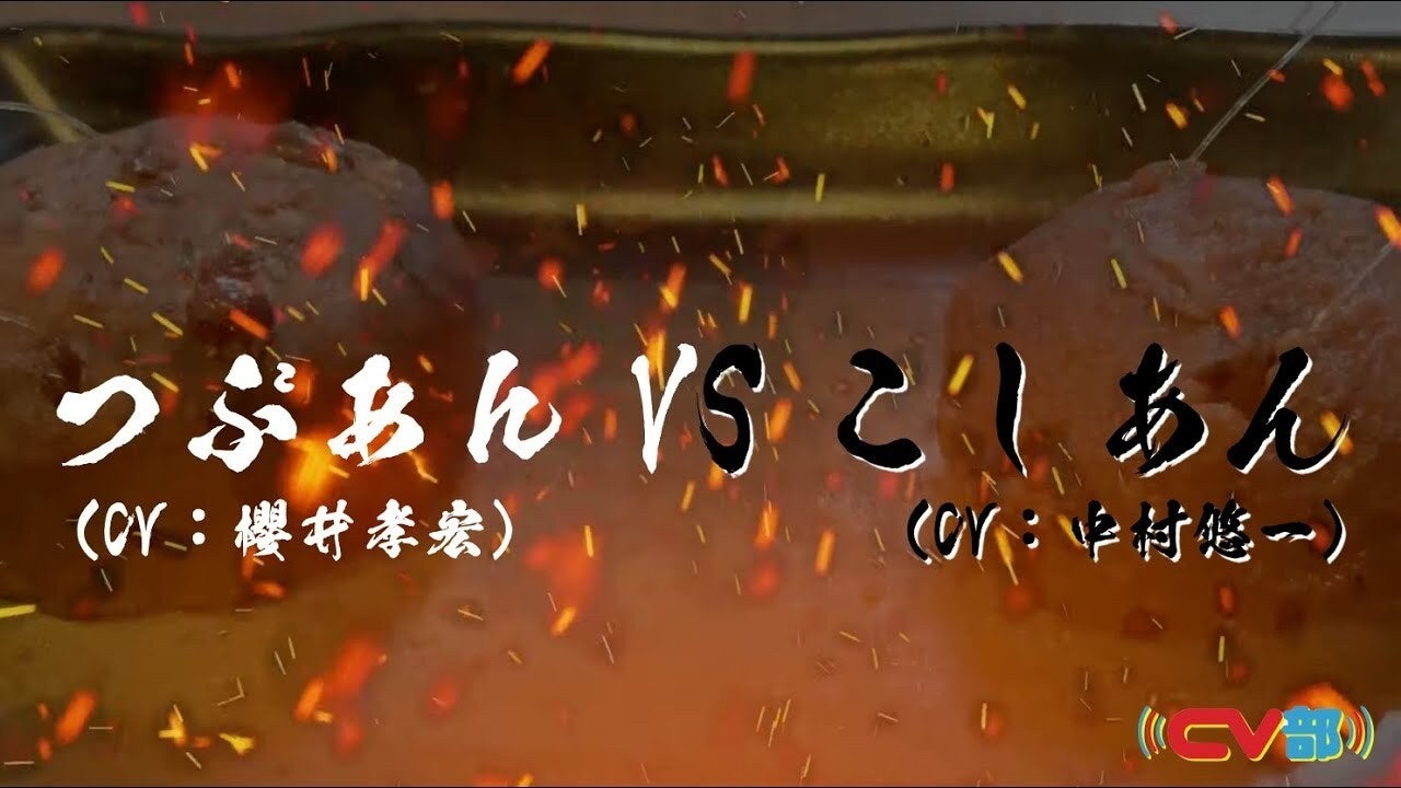 コンテンツスタジオ CHOCOLATE Inc. (本社:東京都渋谷区、代表取締役:渡辺裕介)は、本日1月20日に、身近にある「アレ」に対して、勝手に人格とキャラボイスをあてる“疑人格化”プロジェクトでチャンネル登録者数18万人を突破したYouTubeチャンネル・CV部にて、最新作「つぶあん VS こしあん(CV:櫻井孝宏、中村悠一)」を公開したことをお知らせいたします。本作では、声優の櫻井孝宏が食感のたのしい「つぶあん」に、中村悠一がなめらさが売りの「こしあん」にアテレコ。和菓子界で派閥を争ってきた両者を代表して、因縁の対決を繰り広げます。
