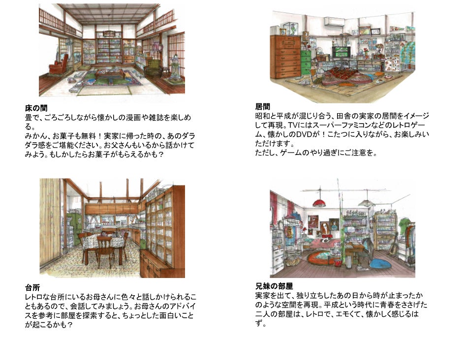 「ウチの実家」は居間、床の間、台所、兄弟部屋の合計4部屋で構成された空間です。それぞれの部屋は、だれもが懐かしいと感じるモノや、「スーパーファミコン」や「PHS」、「プリクラ帳」など昔流行ったモノが所狭しと並んでいます。