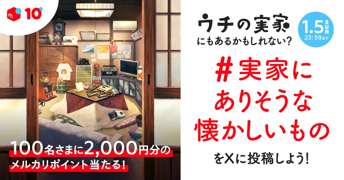 2023年11月16日(木)11:00〜2024月1日5日(金)23:59の間にメルカリ公式アカウント(@mercari_jp)をフォローし「#実家にありそうな懐かしいもの」をX(旧Twitter)に投稿いただくと、抽選で100名さまに2,000ポイントをプレゼントいたします。実家にある懐かしい商品の商品名や、スクリーンショットで撮影した商品画像を投稿してください。