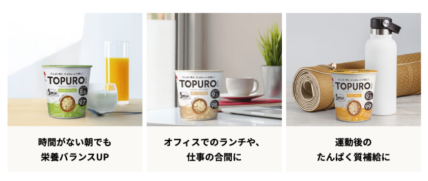 TOPUROは、高野豆腐のたんぱく質をより手軽に摂っていただけるように生まれた新ブランドです。今回発売した3品は、健康・美意識が高い方やたんぱく質を必要とする方の、主食やおかず、間食として様々なシーンでお召し上がりいただくことができます。