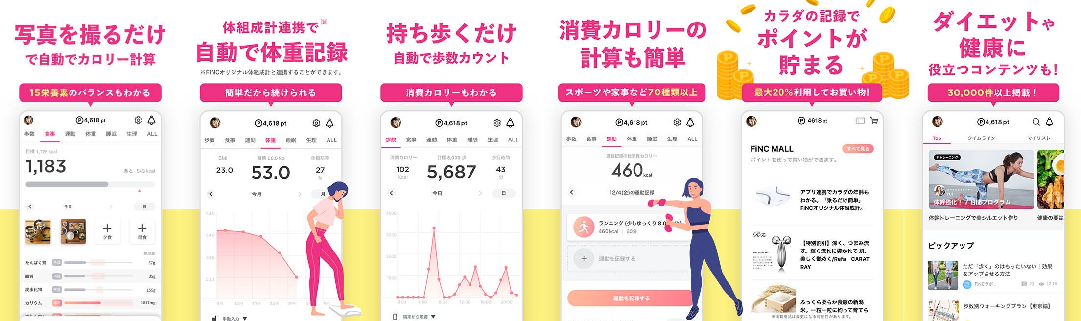 アプリをダウンロードして、スマートフォンを持ち歩くだけで毎日の歩数が貯まり、体重・睡眠時間・食事といったライフログの記録や、歩数に応じて、FiNC MALLで使用できるポイントが付与されます。また著名なアスリート・トレーナー・栄養士といった専門家が発信するエクササイズ・ストレッチ・ヘルシーレシピ・ヨガといった動画コンテンツや、20万件もの食品データベースをはじめ、様々な栄養及び運動プログラムを内蔵し、パーソナルトレーナーAIが、ユーザーひとり一人の興味や悩みにあったメニューを厳選してお届けいたします。ひとりではなかなか続けられない方でも、楽しみながら続けることができるアプリになっています。