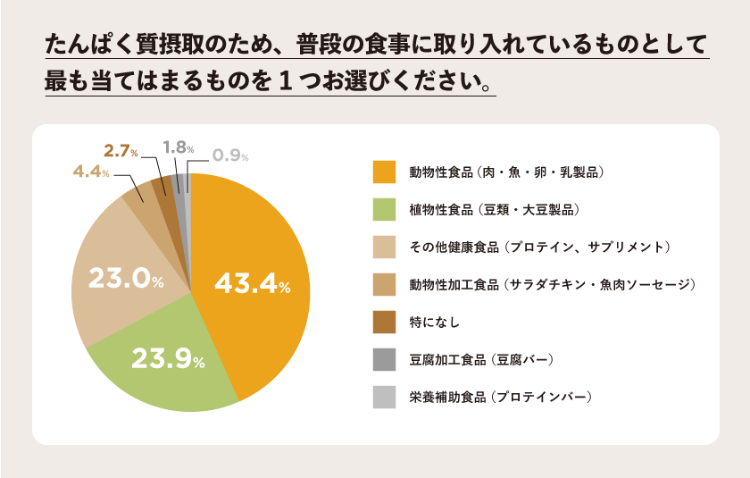 このアンケートの結果から、日常の食事でたんぱく質を充分に摂取できていないと感じている方が半数以上を占め、さらに摂取しているたんぱく質も簡単に調理できる動物性食品に偏りがちであるということが伺えます。