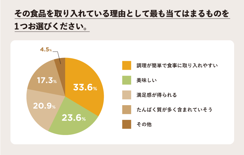 また、上記を選んだ理由としては「調理が簡単で食事に取り入れやすい」が33.6%と1番多く、これは2番目に多かった「美味しい」からという理由よりも重要視されているようです。