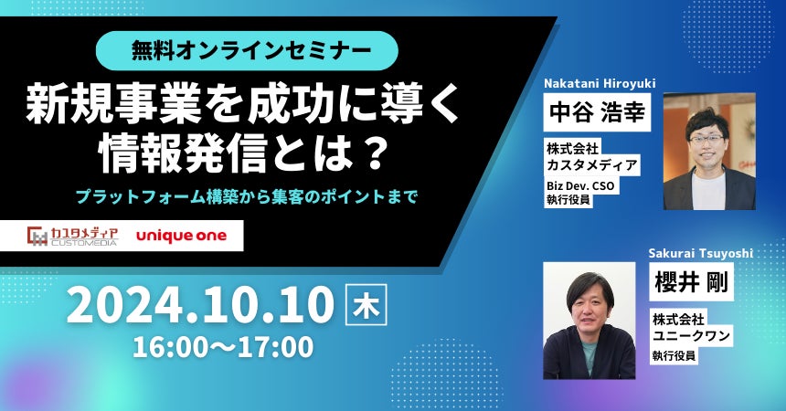 マッチングサービスをはじめとする新規プラットフォーム事業立ち上げのプロ、カスタメディアと、Web集客支援を得意とするユニークワン様。新規事業を立ち上げを検討しているけど、「どのように事業を構築するべきかわからない」「新規事業の集客に不安がある」とお悩みの経営者、役員のみなさまに最適です。参加無料のオンラインセミナーですので、ぜひお気軽にご参加ください。