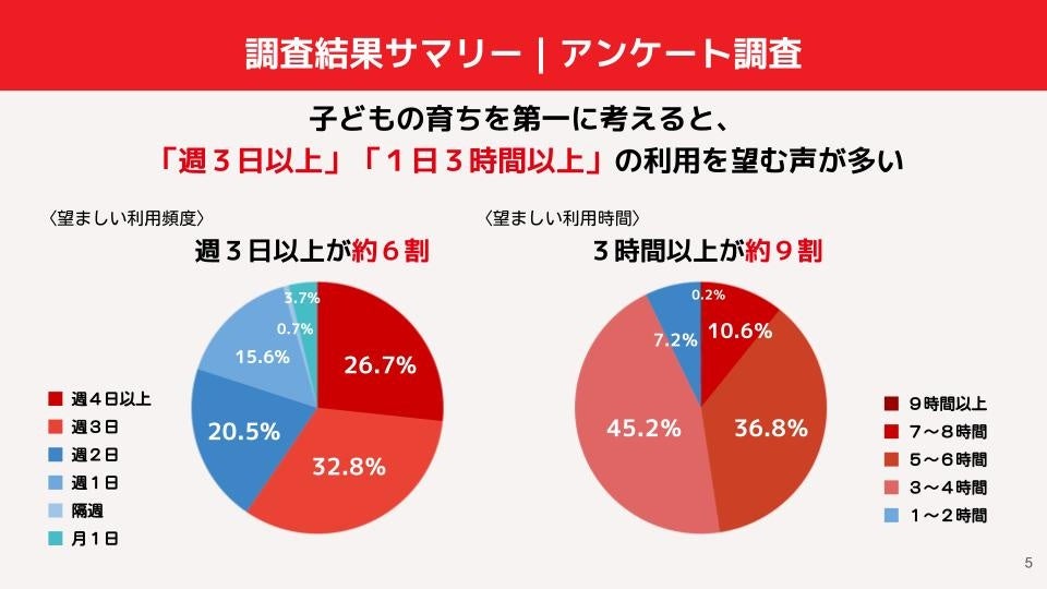 「定期利用の場合、子どもの育ちを第一に考えた際に、1人につき望ましい利用頻度・利用時間」を尋ねたところ、利用頻度については「週4日以上」26.7%、「週3日」32.8%と「週3日以上」が合わせて59.5%にのぼりました。また、1日あたりの利用時間については、「3~4時間」45.2%、「5~6時間」36.8%、「7~8時間」10.6%など、「3時間以上」の回答が9割を超えました。週3回×3時間/1日で利用した場合、月の利用時間は36時間となり、こども家庭庁が現時点で検討している「月10時間」を大幅に超える結果となりました。