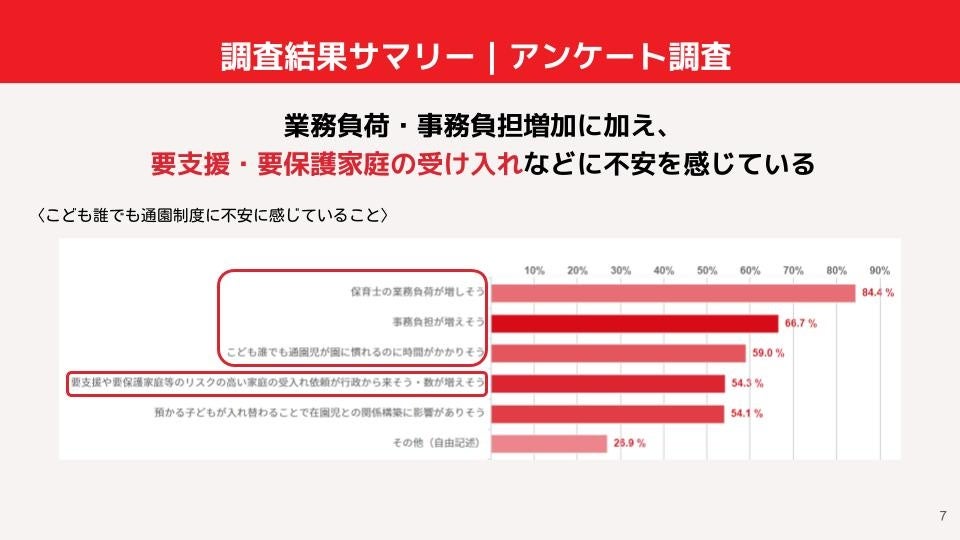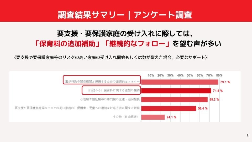 「要支援や要保護家庭等のリスクの高い家庭の受入れ依頼が行政から来そう・数が増えそう」は54.3%でした。「要支援や要保護家庭等のリスクの高い家庭の受け入れ開始もしくは数が増えた場合の必要なサポート」については、「園が行政や関連機関と連携するための継続的なフォロー」が79.1%、「(行政から)保育料に関する追加の補助」71.8%などを求める声が多く寄せられました。