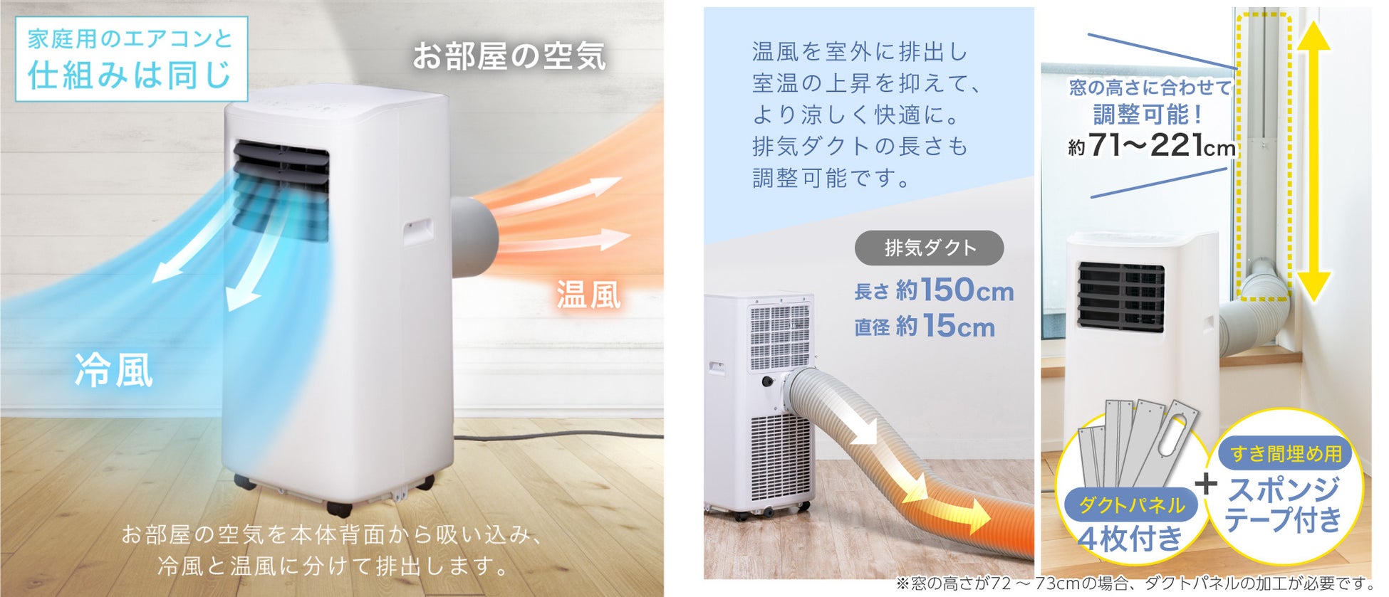 スポットエアコンは、背面から取り込んだ空気を冷風と温風に分け、正面の吹き出し口からは冷風を、背後の排気口からは温風を排出します。通常のエアコンと異なるのは、室外機ではなく背後のダクトから温風を排出する点です。そのため、付属の排気ダクトやダクトパネルを使用し、温風を室外に排出することで、冷却効率を向上させることができます。