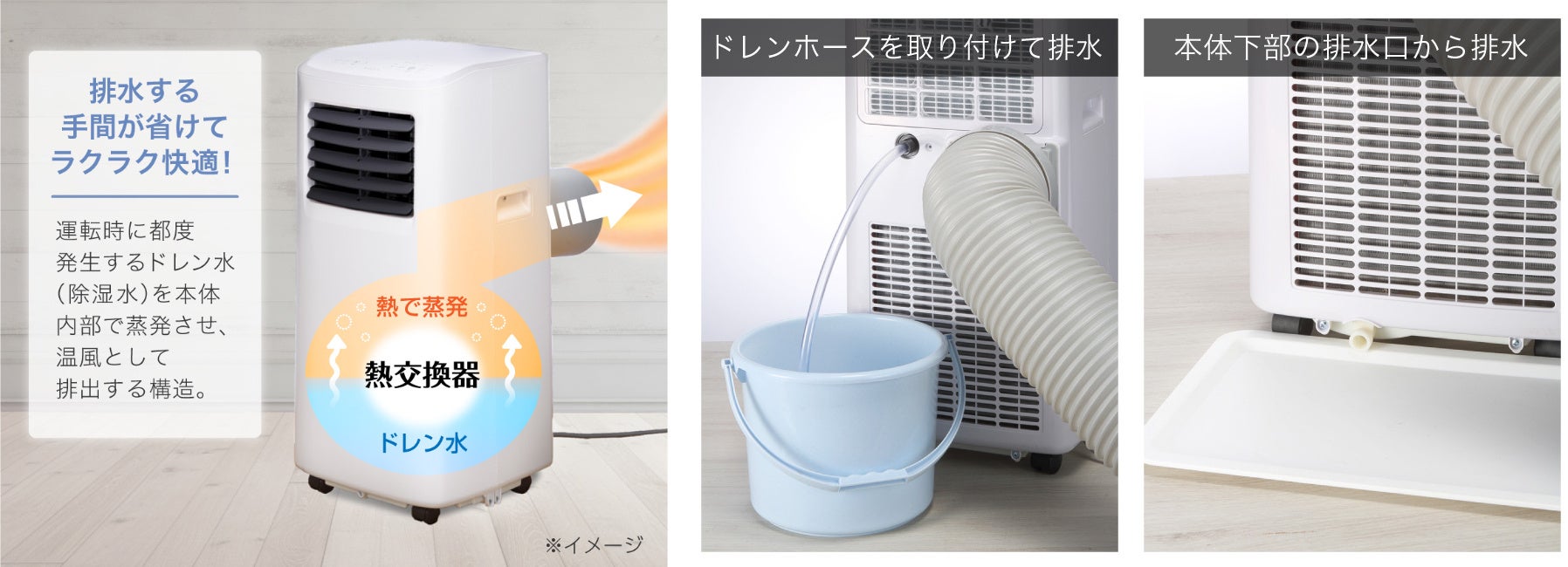 スポットエアコンの運転中にはドレン水(除湿水)が発生しますが、本製品ではノンドレン方式を採用しており、ドレン水を蒸発させて温風として排出することができます。そのため、ドレン水の排出頻度を減らし、排水の手間を軽減できます。ドレン水はドレンホースまたは下部排水口を使用して排水することができます。