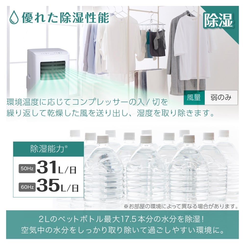 本製品には、冷風・送風・除湿の3つの運転モードを備えており、設定温度に合わせて自動で冷風と送風のうち、適切なモードに切り替えます。また、除湿においては、1日当たり31L~35L(2Lペットボトル約17.5本分に相当、MSC22JH-WHの場合)の除湿能力を有しており(※)、不快な湿気を取り除いて梅雨時でも過ごしやすく、部屋干しをしやすい環境を整え、暑い夏でも快適にお過ごしいただけます。