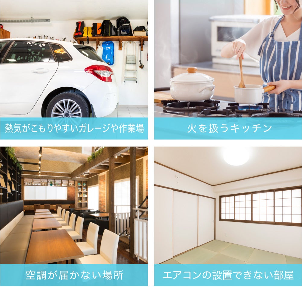 工事不要で設置でき、なおかつ、本体にはかんたんに各種設定ができるシンプルなデザインのボタンと、スムーズに動く4つのキャスターを装備しております。どこでも簡単に置き場所を移動することができるので、熱気がこもりやすいガレージや、火の取扱いにより温度が上がりやすいキッチン、空調が届かない場所やエアコンが設置できない部屋にピッタリの製品です。