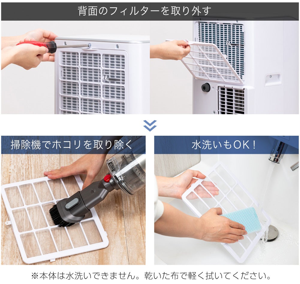 本体背面にあるフィルターは取り外し可能で、水洗い可能な為、かんたんにお手入れすることができます。