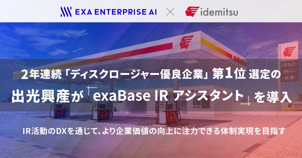 株式会社エクサウィザーズのグループ会社である株式会社Exa Enterprise AI(東京都港区、代表取締役:大植 択真、以下Exa Enterprise AI)は、出光興産株式会社(以下出光)が当社の「exaBase IRアシスタント」の導入を開始したことをお知らせします。出光は、業務特化型の生成AIをIRや広報など情報開示に関係する各部門で活用し、担当者の業務DXを推進し、付加価値の高い情報開示へと注力できる体制の実現を図ります。
