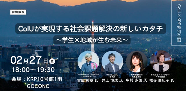 京都リサーチパーク株式会社(本社:京都市下京区、代表取締役社長:浅野貢男、以下、KRP)は、2026年2月27日(金)に、飛騨古川に2026年春開学予定のコー・イノベーション大学(Co-Innovation University、略称:CoIU)による京都での活動本格始動を記念し、「CoIUが実現する社会課題解決の新しいカタチ ~学生×地域が生む未来~」を開催します。本イベントは、CoIUが京都に設ける地域キャンパスでの活動開始を応援するとともに、地域課題解決に向けた新しい視点と人の流れ、連携のカタチを紹介するキックオフイベントです。