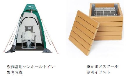 万一の災害発生時に備え、マンホールの蓋を外して設置するトイレ、炊き出しに利用できるかまどスツールを設置しています。