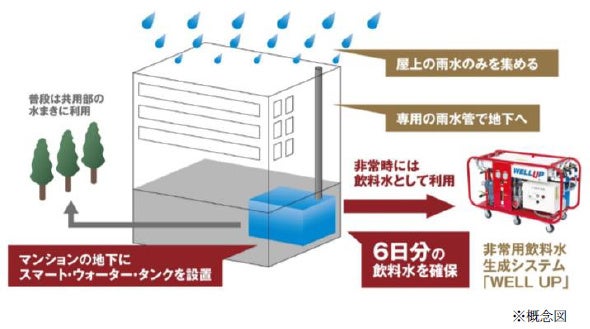災害時の断水には非常用飲料水生成装置「WELLUP」を利用し、入居者の6日分の飲料水を確保します。平常時には植栽の潅水に利用します。
