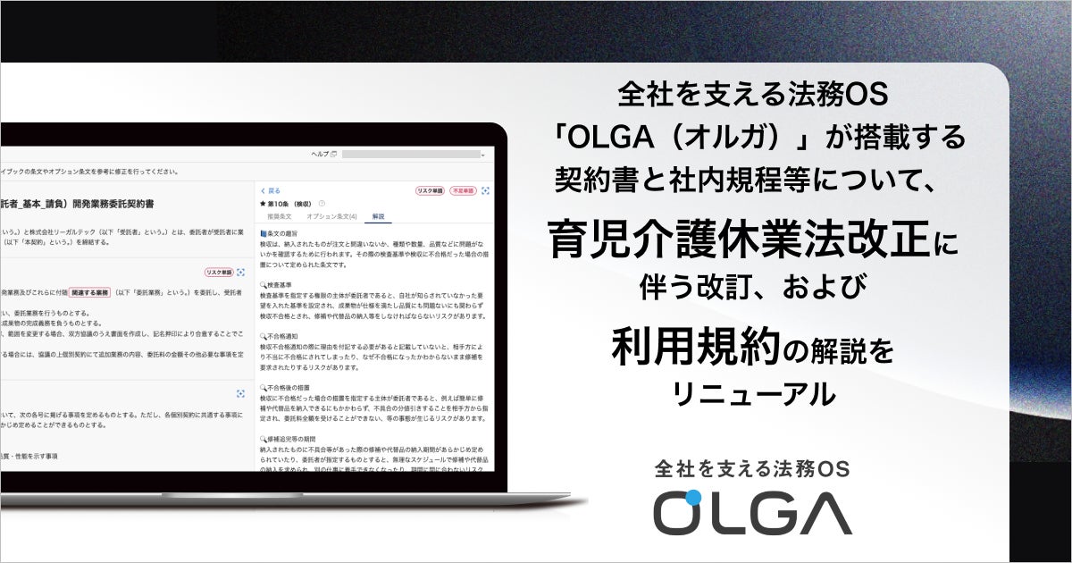 全社を支える法務OS「OLGA(オルガ)」が搭載する契約書と社内規程等について、育児介護休業法改正に伴う改訂および利用規約の解説をリニューアル