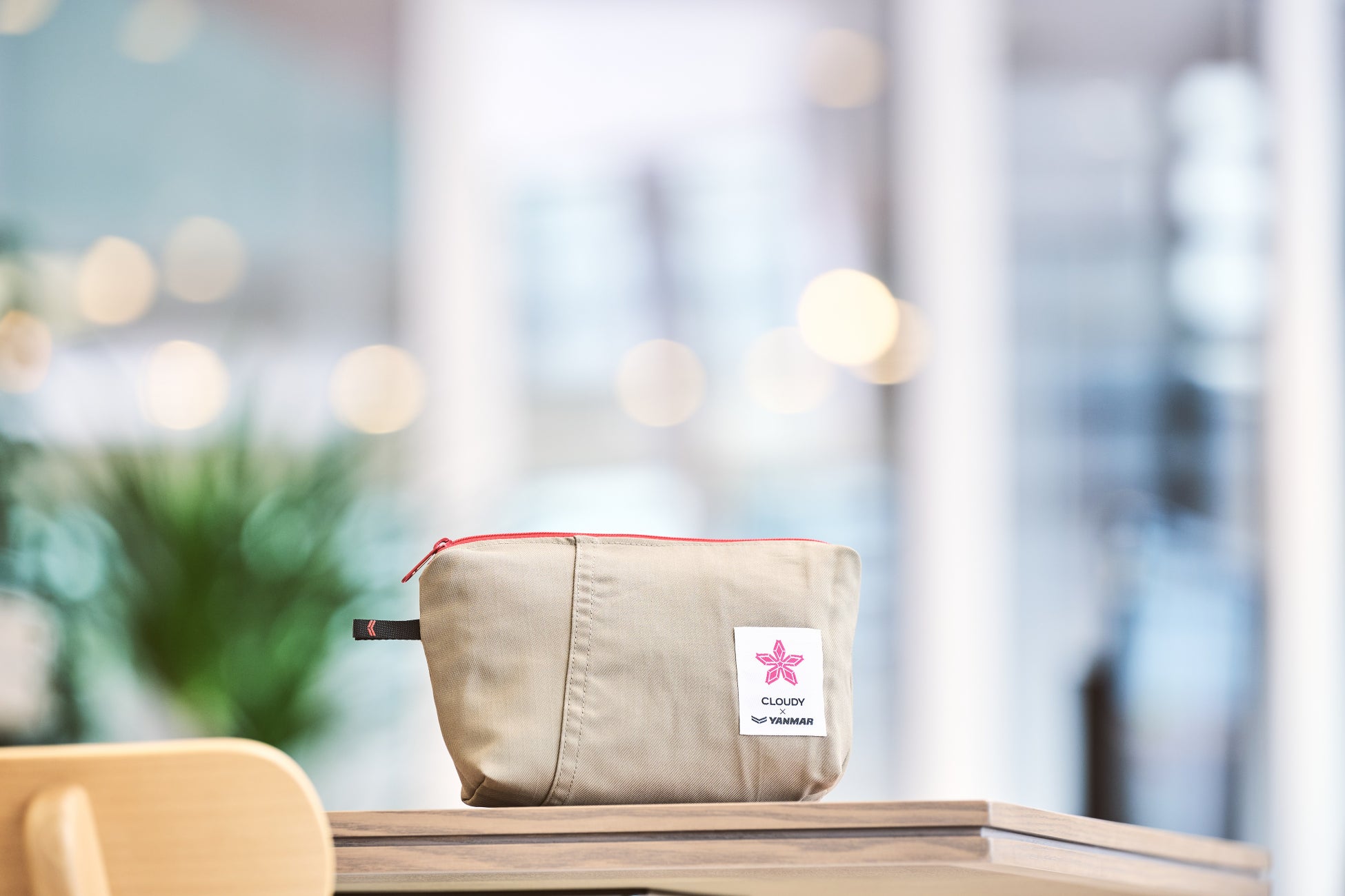 本プロジェクトでは、リニューアルに伴い廃棄予定だったヤンマーの旧ユニフォームをグループ内から回収し、ポーチにアップサイクルします。今回のクラウドファンディングでは、工場などの現場で使われる丈夫なユニフォームの袖部分の生地を使用し、ステッチなどが少しずつ違う1点物のオリジナルポーチとして、限定550個用意しました。また、ポーチの内側にはCLOUDYのアフリカ人デザイナーが手掛けたカラフルなテキスタイルを採用しました。アップサイクルによるサステナブルな取り組みに加え、売上の10%をアフリカの子どもたちの給食費として寄付します。