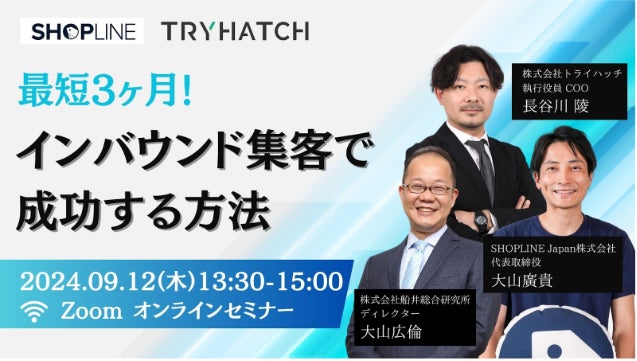 株式会社ベクトル(本社:東京都港区、代表取締役会長兼社長:西江 肇司、東証プライム:6058)の子会社である株式会社トライハッチ(東京都新宿区、代表取締役社長、武藤 尭行)は、株式会社船井総合研究所(大阪府大阪市、代表取締役社長、真貝大介、以下 船井総合研究所)、SHOPLINE Japan株式会社 (日本現地法人:SHOP LINE Japan株式会社、東京都千代田区、代表取締役:大山廣貴、カタカナ表記:ショップライン、以下SHOPLINE)と共同で、無料オンラインセミナー『最短3ヶ月でインバウンド集客に成功する方法』を9月12日(木)13時30分より開催いたします。