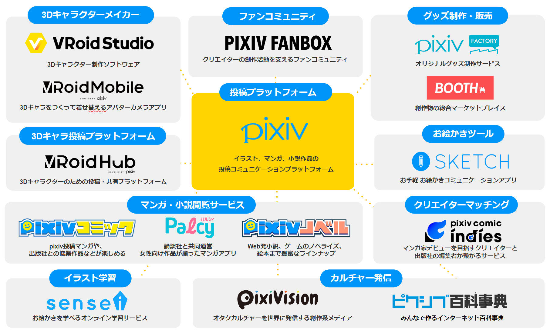 「Accelerate creativity. 創作活動を、もっと楽しくする。」という理念のもと、クリエイターを支援するさまざまなサービスを提供しています。登録者数9800万人を超える、イラスト、マンガ、小説作品の投稿プラットフォーム「pixiv」、創作物の総合マーケットプレイス「BOOTH」、ファンコミュニティ「pixivFANBOX」、3Dキャラクター制作ソフトウェア「VRoid Studio」など16の事業を展開し、世界中の人々の創作活動を応援しています。