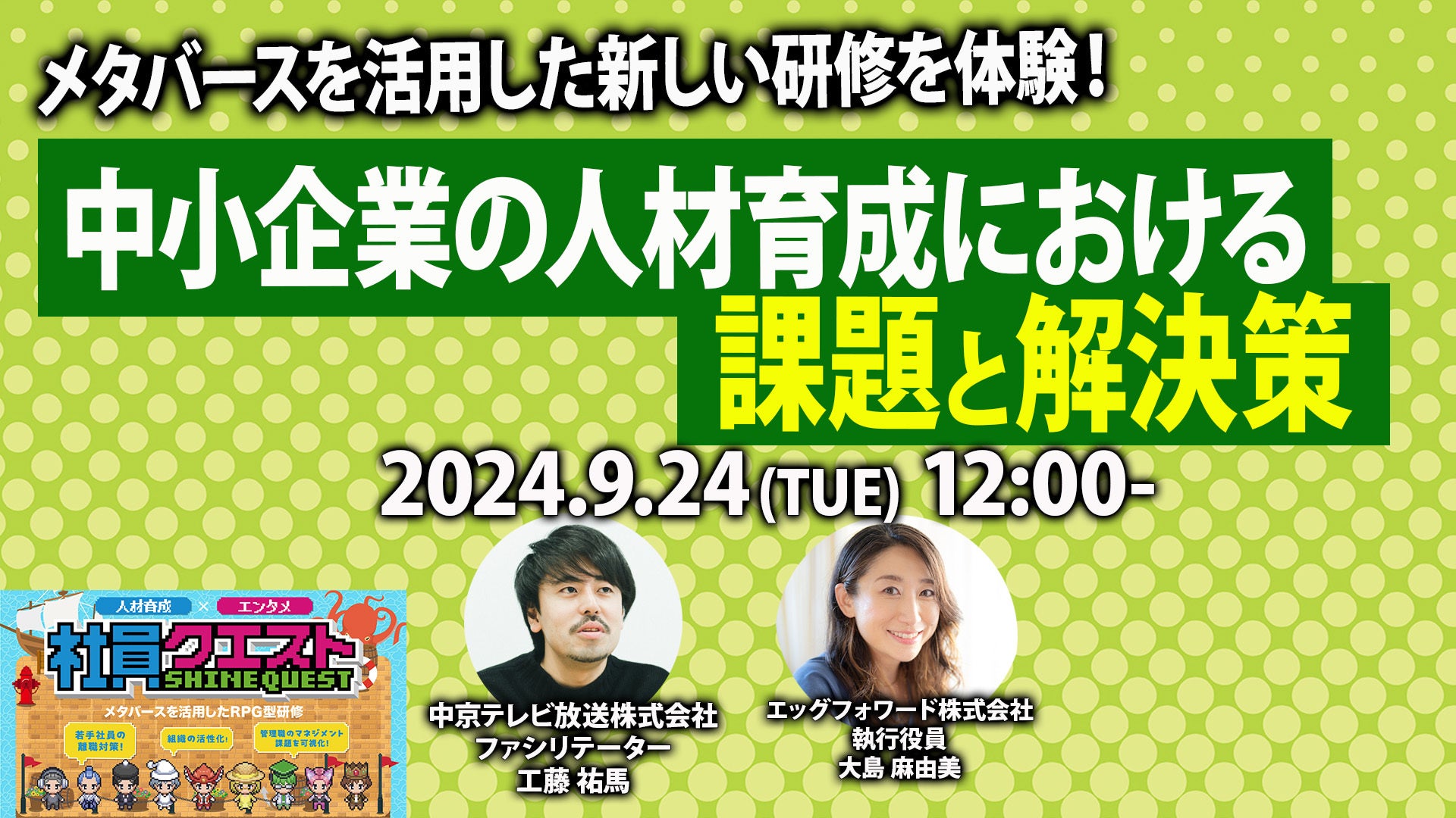 9月24日(火)12時から、中京テレビ放送株式会社(愛知県名古屋市中村区、代表取締役社長:伊豫田祐司、以下:中京テレビ)は、「中小企業の人材育成における課題と解決策」をテーマにエッグフォワード株式会社(本社:東京都渋谷区、代表取締役社長:徳谷智史、以下:エッグフォワード)と、中小企業の人材開発の課題と解決策に関するウェビナーを開催します。
