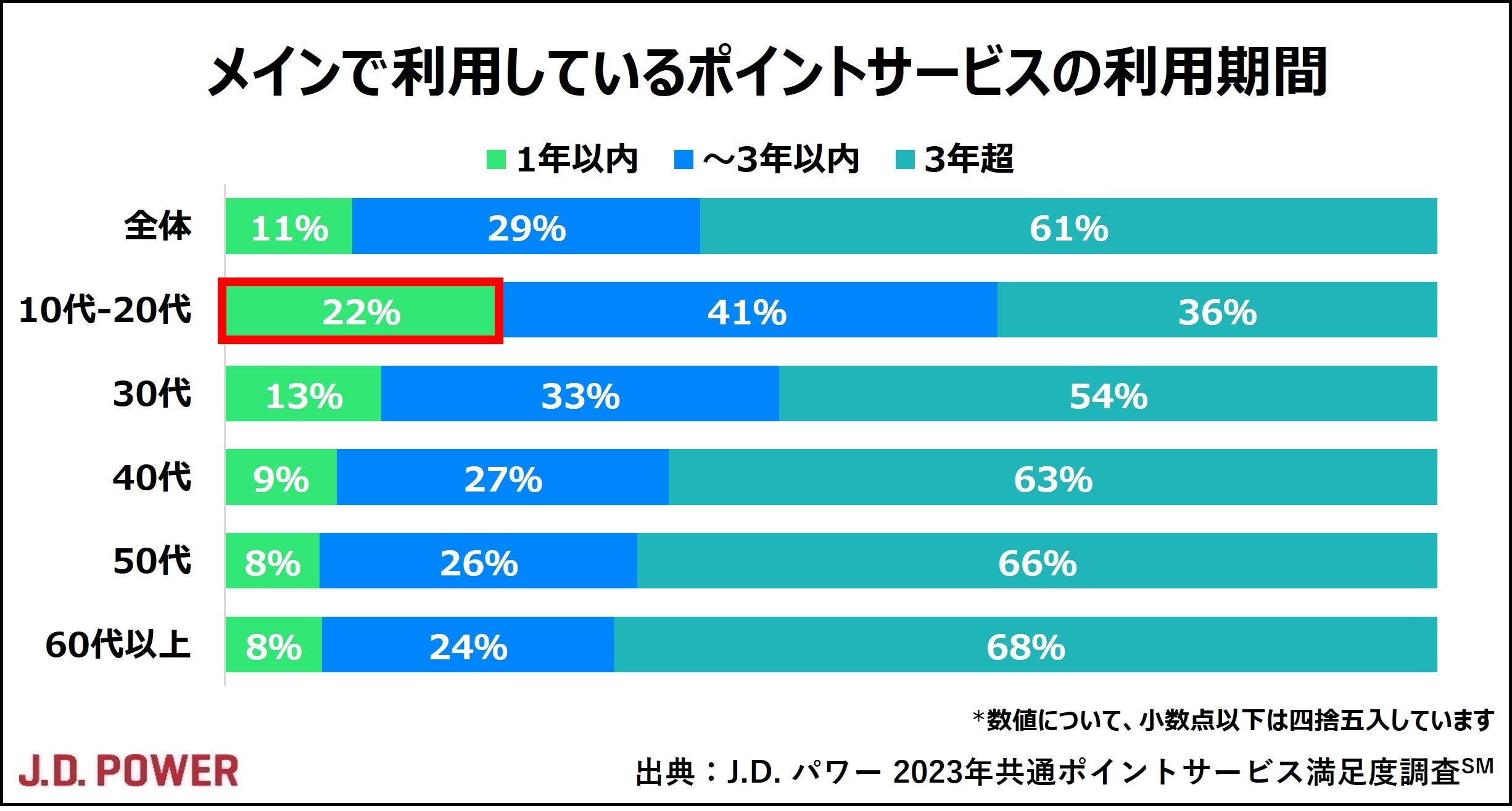 昨年調査(2023年10月発表)によると、メインで利用している共通ポイントサービスの利用期間は6割以上(61%)が「3年超」であり、「1年以内」は約1割(11%)にとどまりました。多くのユーザーは、一度メインの共通ポイントサービスを利用し始めると他のサービスへスイッチしない傾向にあると言えます。しかし、年代別に見ると、10代-20代の若年層においては「1年以内」が2割超(22%)に達し、他の世代と比べて約2~3倍となっており、新規ユーザーの獲得には、若年層をターゲットとしたサービス戦略が重要になると考えられます。