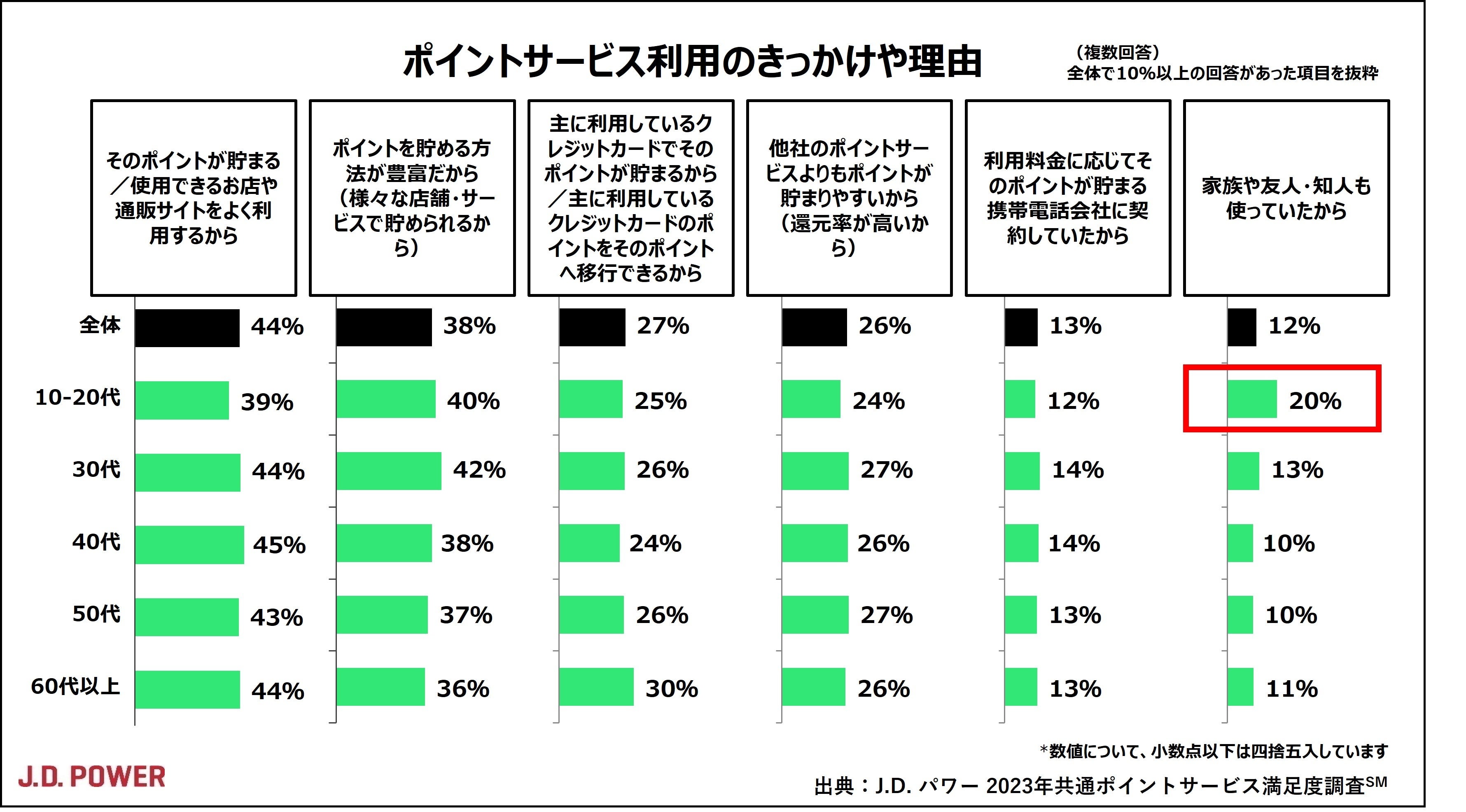 また、メインで利用している共通ポイントの利用のきっかけや理由として、どの年代においても「そのポイントが貯まる/使用できるお店や通販サイトをよく利用するから」、「ポイントを貯める方法が豊富だから(様々な店舗・サービスで貯められるから)」が共に4割前後と多く挙がっており、ポイントの貯まりやすさが主要因となっています。こうした中、若年層においては「家族や友人・知人も使っていたから」を理由に挙げるユーザーが2割と、他の年代よりも多いことが特徴です。