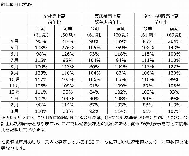 株式会社セキド(本社・東京都新宿区、社長・関戸正実、証券コード:9878)は、2023年3月度(2月21日~3月20日)の売上高が、全社の前年比120%、GINZALoveLove実店舗の既存店前年比92%、ネット通販の前年比91%となりました。なお、数値はPOSデータに基づいた速報値であり、決算数値とは異なります。