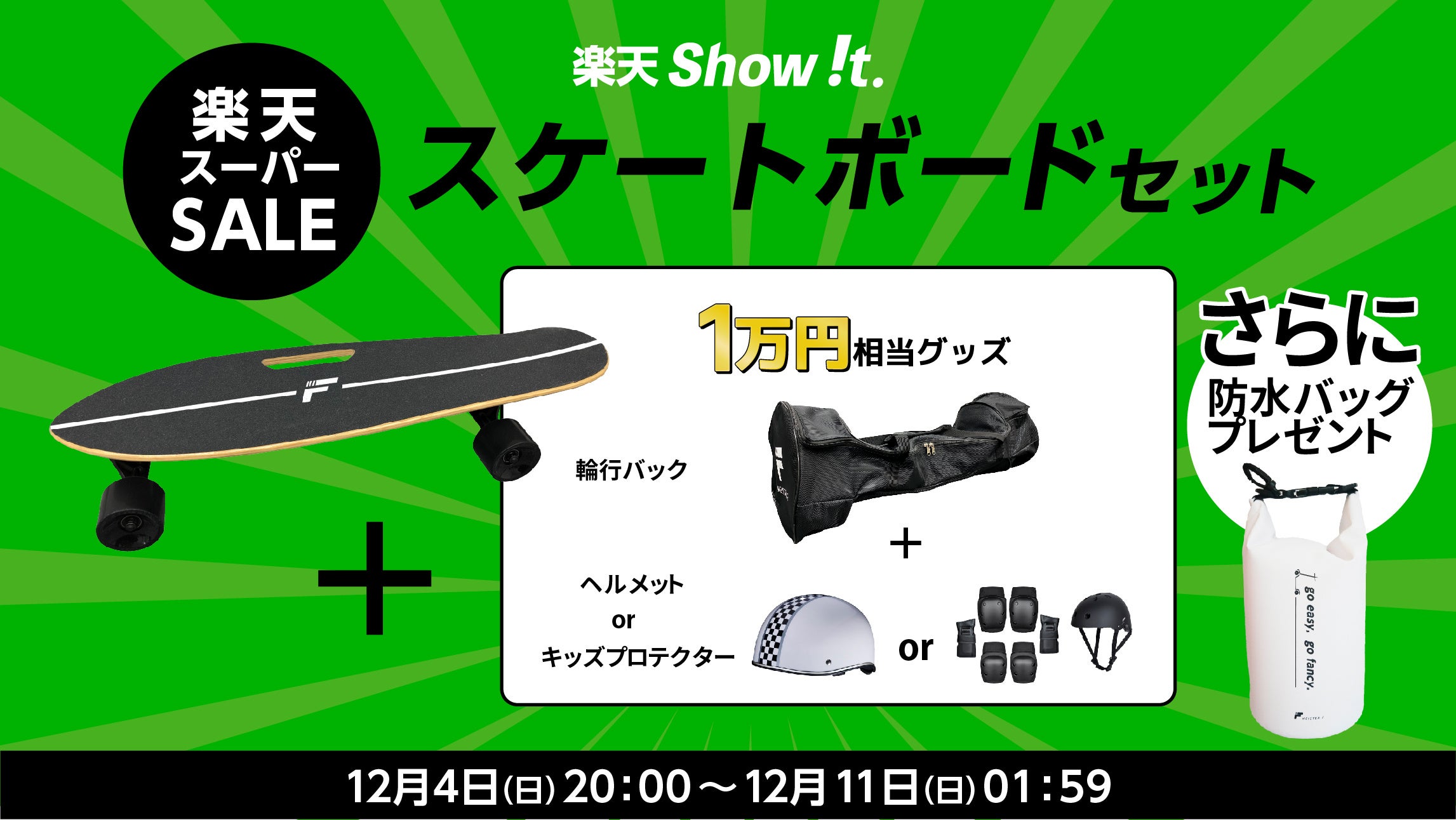 楽天市場「Show !t」12月4日(日)20時開始、ポイント10倍!楽天スーパーセールに参加。さらに、電動スケートボードをご購入の方にヘルメット・輪行バックセットのプレゼントキャンペーンを実施。