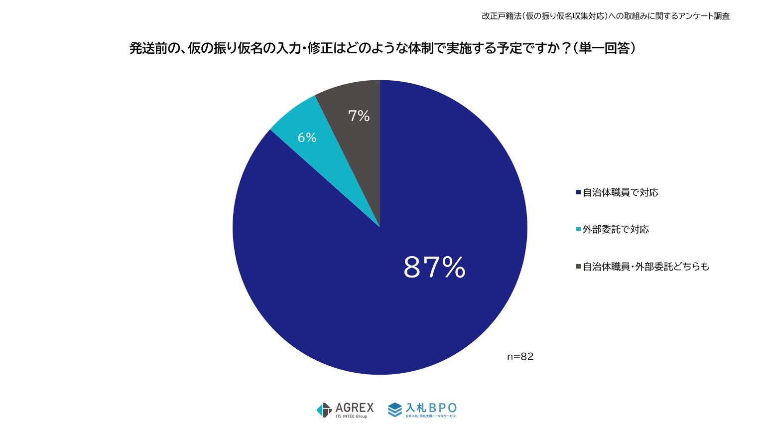 <結果2>で「実施済み」「実施する予定」「どちらともいえない」と回答した自治体の9割近く(87%)が、仮の振り仮名の修正業務を「自治体職員で対応」と回答<結果3>