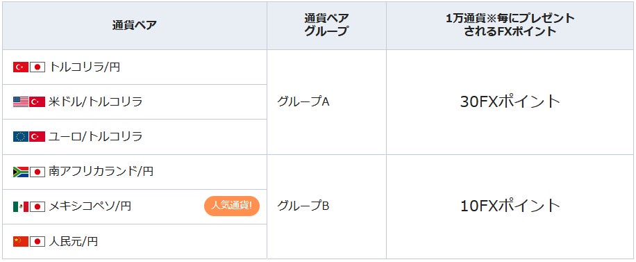 株式会社外為どっとコム(本社:東京都港区、代表取締役社長:竹内 淳)は、店頭FX『外貨ネクストネオ』にて、対象通貨ペアごとの取引数量に応じてFXポイントをプレゼントするキャンペーンを2022年8月1日(月)より実施します。高金利通貨ペアをもっと身近に感じていただくために、新規注文1万通貨毎に所定のFXポイントをプレゼントいたします。